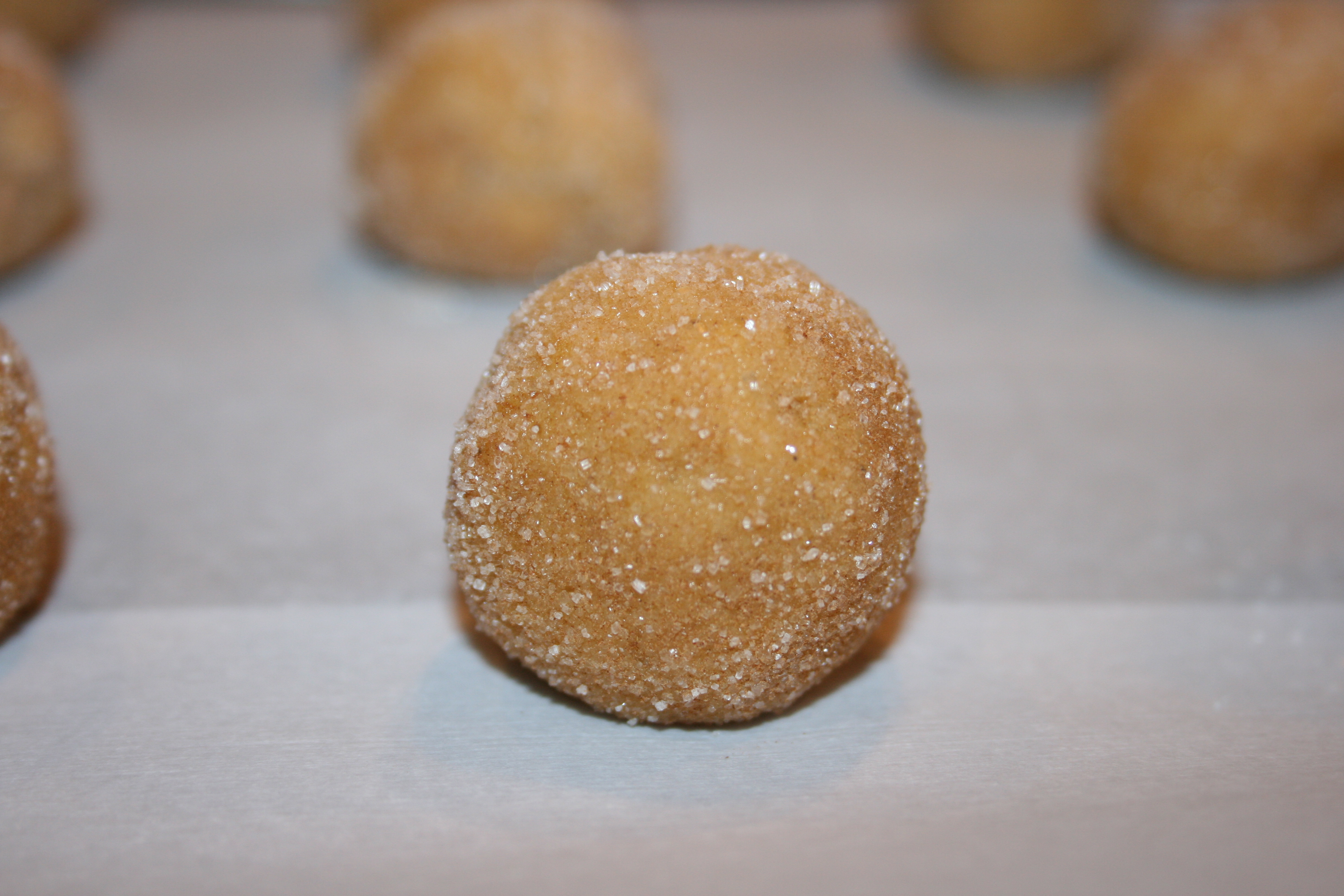 - Place the remaining 1/4 cup sugar and cinnamon for rolling in a shallow bowl. Roll a heaping tablespoon of dough into a 1½-inch ball, roll the ball in the sugar mixture, and place it on the prepared baking sheet. Repeat with the remaining dough, spacing the balls about 2 inches apart