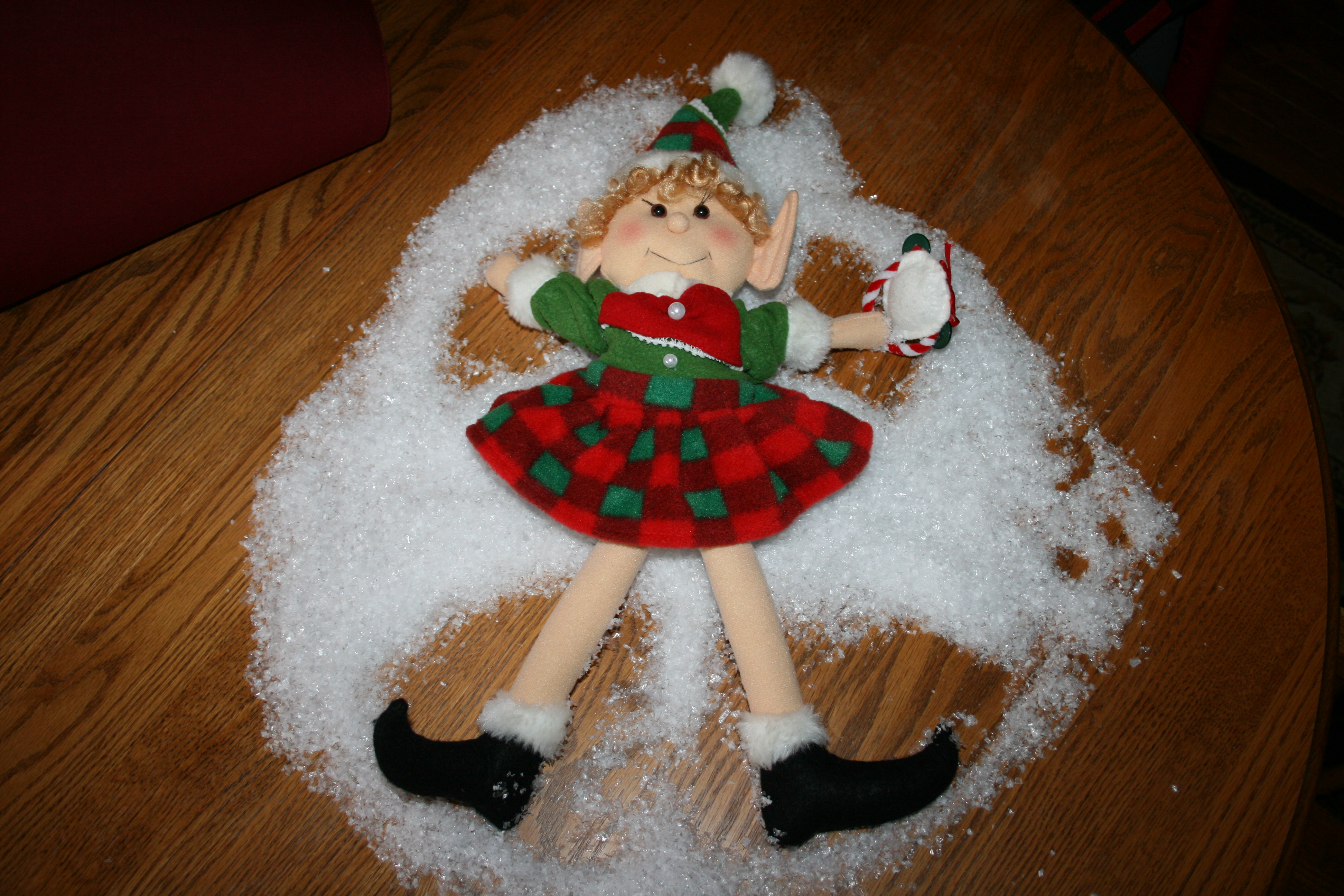 Jingles making snow angels on the kitchen table.